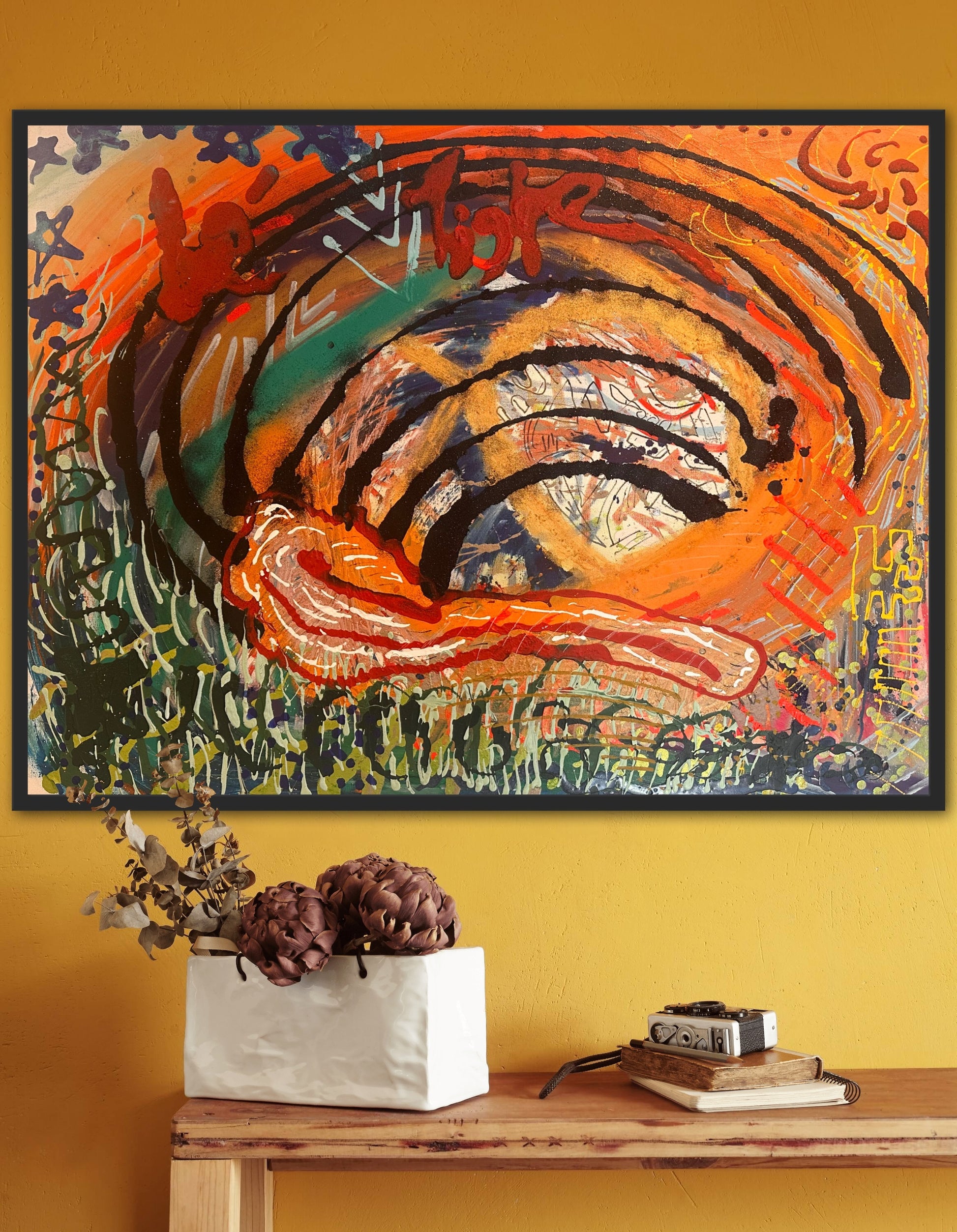 This piece represents A deconstructed tiger in his native habitat preying on his next target(Goal). It represents authenticity, fierceness and strength. Its bold composition provokes one to remember to have the EYE OF THE TIGER!