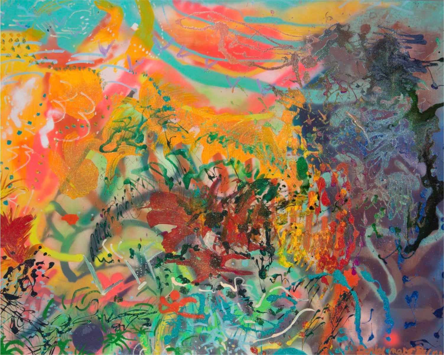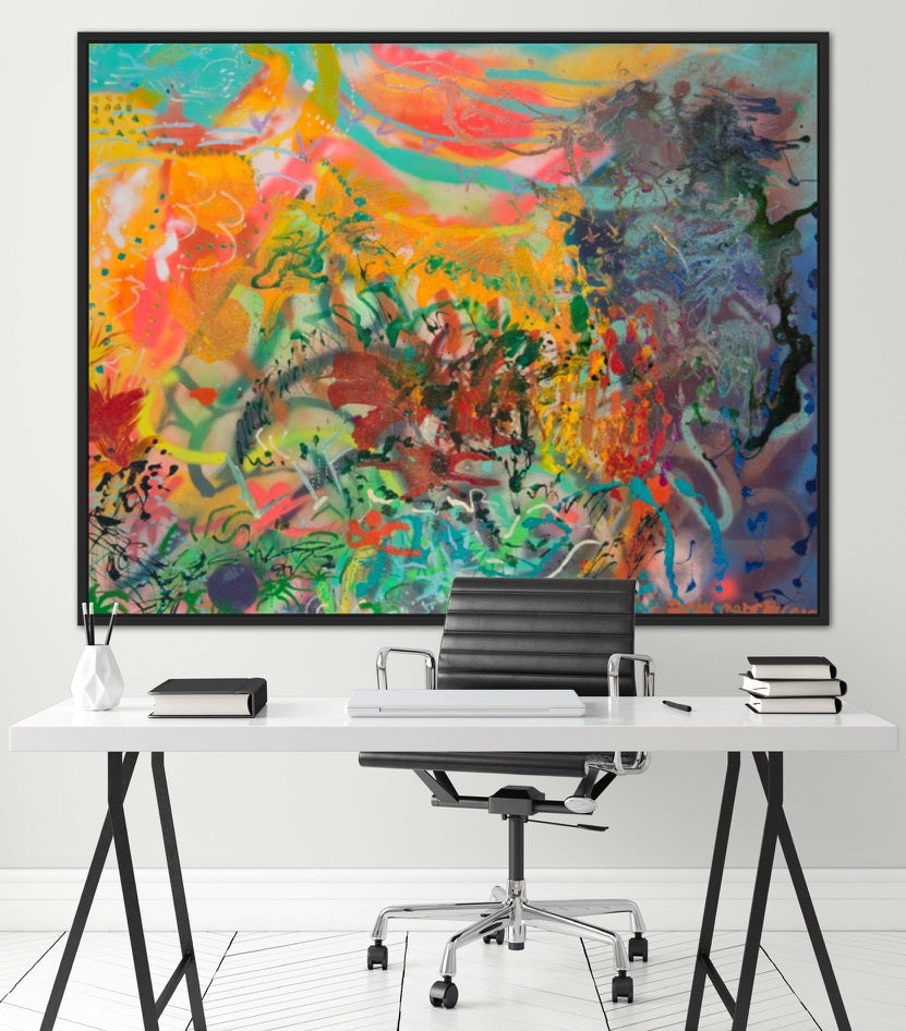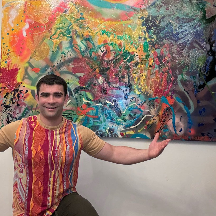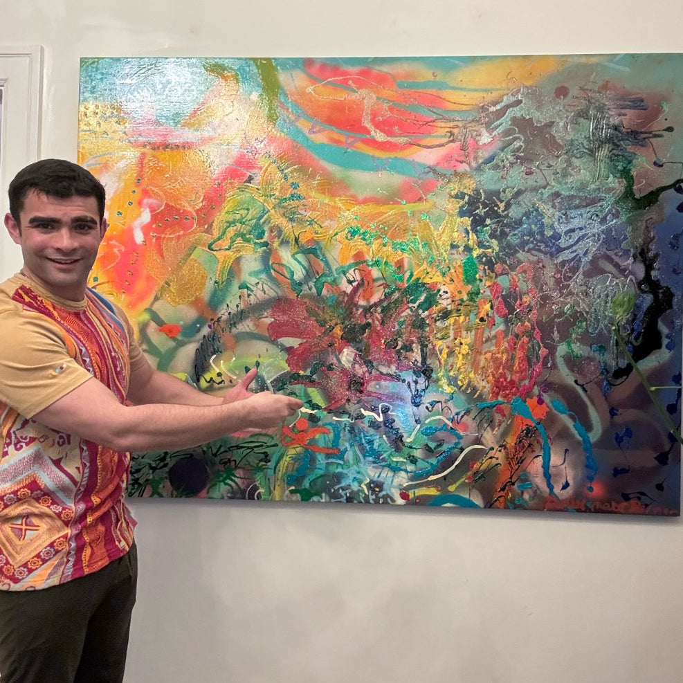 This piece depicts the silhouette of a boy in blue viewing the world and the surroundings in front of him. These include various flowers, birds, and beautiful skyscapes and people dancing. It is symbolic for waking up everyday and seeing the beauty that’s right in front of you and being grateful for what you have and to ”smell the Blooms”